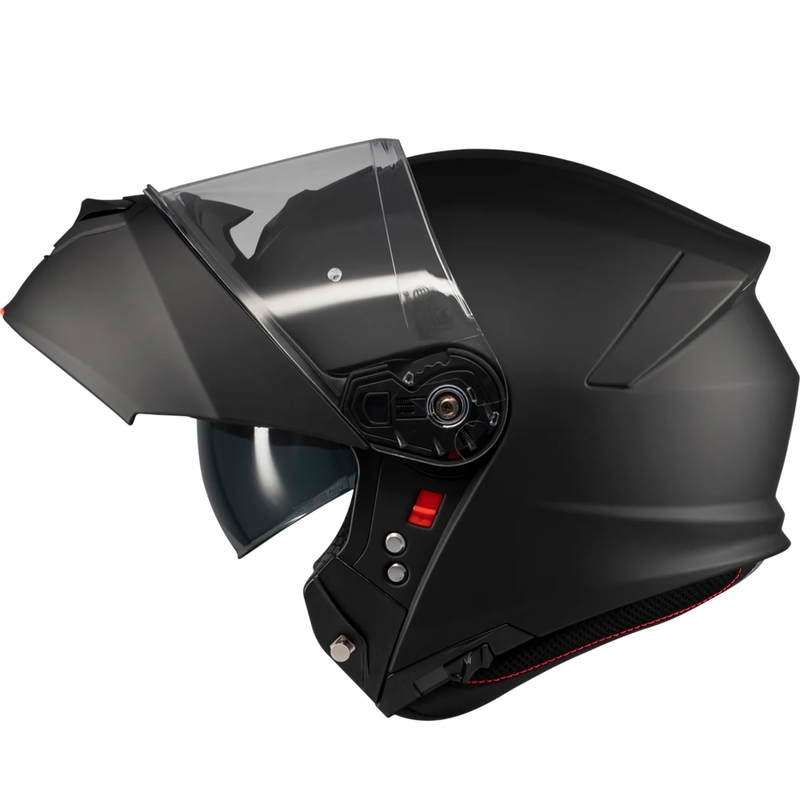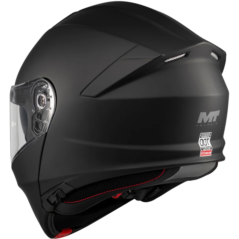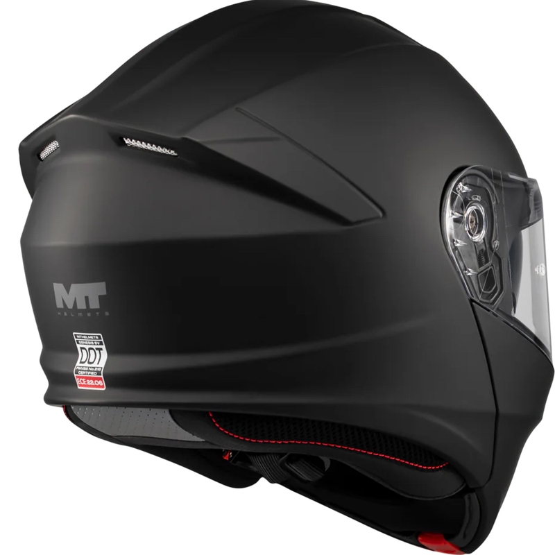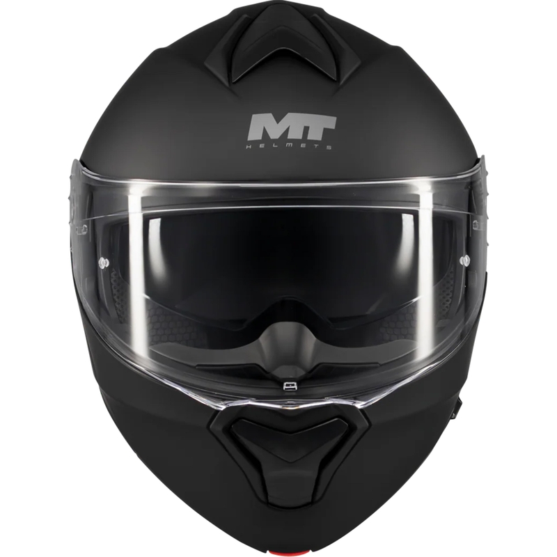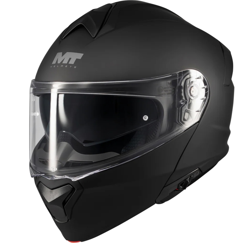 Výklopná prilba od MT Helmets rozširuje ponuku výklopných modelov a ponúka cenovo dostupný vstup do tejto kategórie. Moto prilba kombinuje vysokú bezpečnosť, praktické funkcie a výborný pomer cena–výkon, takže zaujme široké spektrum jazdcov. Je vyrobená z odolného materiálu HIRP a ponúka dve veľkosti škrupiny. EPS s viacerými hustotami zabezpečuje lepšiu absorpciu nárazov. Interiér je úplne vyberateľný pre jednoduchú údržbu. Plexi má odolnú konštrukciu, optimalizovaný mechanizmus otvárania a je kompatibilné s vložkou Pinlock DKS002. Integrovaná slnečná clona poskytuje takmer stopercentnú ochranu vďaka napojeniu na nosný deflektor. Ventilačný systém Air Flow Channel zabezpečuje lepšie prúdenie vzduchu. Prilba na motocykel je pripravená na komunikátor. Zapínanie je mikrometrické so systémom dvojitého zubu, ktorý bráni nechcenému otvoreniu. Súčasťou je nosný deflektor. Hmotnosť moto prilby je približne 1675 g a spĺňa homologácie ECE 22.06, DOT a P/J.