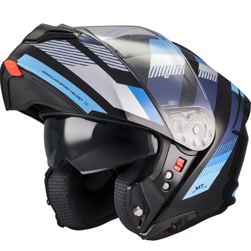 Výklopná prilba od MT Helmets rozširuje ponuku výklopných modelov a ponúka cenovo dostupný vstup do tejto kategórie. Moto prilba kombinuje vysokú bezpečnosť, praktické funkcie a výborný pomer cena–výkon, takže zaujme široké spektrum jazdcov. Je vyrobená z odolného materiálu HIRP a ponúka dve veľkosti škrupiny. EPS s viacerými hustotami zabezpečuje lepšiu absorpciu nárazov. Interiér je úplne vyberateľný pre jednoduchú údržbu. Plexi má odolnú konštrukciu, optimalizovaný mechanizmus otvárania a je kompatibilné s vložkou Pinlock DKS002. Integrovaná slnečná clona poskytuje takmer stopercentnú ochranu vďaka napojeniu na nosný deflektor. Ventilačný systém Air Flow Channel zabezpečuje lepšie prúdenie vzduchu. Prilba na motocykel je pripravená na komunikátor. Zapínanie je mikrometrické so systémom dvojitého zubu, ktorý bráni nechcenému otvoreniu. Súčasťou je nosný deflektor. Hmotnosť moto prilby je približne 1675 g a spĺňa homologácie ECE 22.06, DOT a P/J.